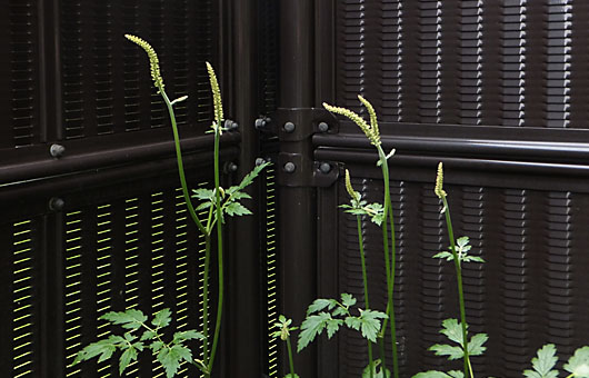 今年もサラシナショウマ(更級升麻)の花芽が大量に出揃いました。画像に写っているだけで、全体の半分といったところです。自然界なら、例えば標高2500m前後では間もなく(7月下旬)開花します。ところがどういう訳か我が家では、開花期は大幅に遅れて9月末から10月になってしまいます。これが悲劇の原因になっています。 この品種は暑さに対する耐力は貧弱なようで、花芽の大半は暑さに負けて枯死してしまいます。故郷の高山帯並に7月下旬から8月にサッサと咲いてしまえば、酷暑に晒される期間は短くて済むのでしょうが、これが遅れるばっかりに余計に暑い期間を過ごすことになります。この結果、花穂全体が枯れたり、先端が半分枯れるという被害が続出します。今年は梅雨明けも早まる気配なので、更に条件は不利になりそうです。ここに写り込んだ顔ぶれのうち、どれほどが元気に開花を迎えられるか、気になるところです。
