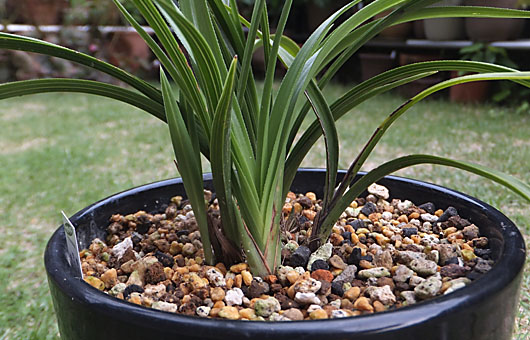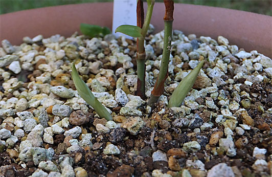 5月上旬から6月上旬にかけて顔を出したシュンラン(春蘭)・「天紅香」の新子ですが、この1ヶ月余りでしっかり身長が伸びて、芽出しの早かったものは古株と遜色のない草丈になりました。上の画像の中央のやや色の薄いものや、左端の横を向いた背の低いものがそうした新子たちです。このポットでは5月から6月に3芽顔を出したのですが、ここに来て新たに3芽が顔を出し始めました。 この時期に顔を見せるというのは実は中途半端な話で、遅れてやってきた新子か、または早出しの花芽なのか判断に迷うところです。通常花芽が現れるのは9月ごろからなのですが、稀に8月に入って顔を出したものが花芽だったという実績もあります。そんな訳で下の画像の中央部や左(ピンボケですが)の新しい芽がどっちなのかについてはすぐには判定がつかず、2週間ほど待つ必要があります。仮に3芽全てが遅れて来た新子なら、今年一気に株立ちが2.5倍に増えることになるし、花芽だったら「早出出勤ご苦労様」ということで、来年もほぼ確実に花が見られることになり、それはそれで喜ばしい出来事と言えます。どっちに転んでも保護者としては顔がほころぶ話ですが、お盆ごろには結論が出ていることだろうと思います。