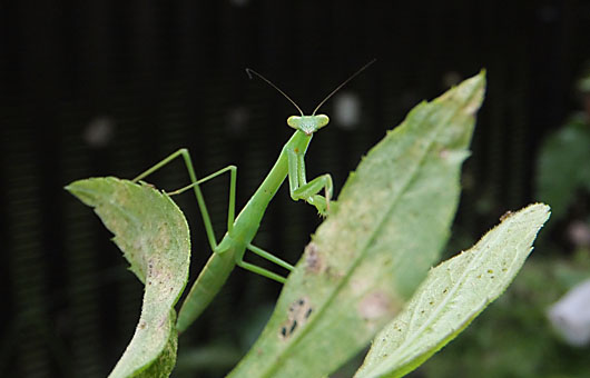 プチ花壇で暴れ始めた雑草を何とかしなくては・・ということで、暑いのを我慢して外に出てみました。エイヤッと引き抜いた雑草の1つに、体長2cmほどのかわいいカマキリが・・・。15cmに近いような大人級のカマキリなら、悲鳴は我慢しても、思わず投げ出してしまうところですが、相手は子供。静かに移動して、カメラを向けてみました。 レンズから子カマキリまでの距離は5-6cm。子カマ(キリ)にしてみれば、奇妙なものを近付けて来て何をされるか、少なからずビビッていたに違いありません。それでも顔は真っすぐにレンズを睨み付け、両手(カマ)は揃えてアゴの前に置きガードしています。ボクシングのファイティングポーズそのものですが、残念なことにシャッターを押す間合いが悪く、子カマが両手を少し下げたタイミングで写ってしまいました。”戦う子カマ”の雄姿を撮り逃したのはちょっと残念です。 余談ですが、昨秋我が家の網戸にカマキリが巣を作ってしまいました。春になって連日数十匹が孵化して巣立って行きましたが、この子カマもそのうちの1匹かもしれません。巣立った子カマの多くは敷地外に散らばったことでしょうが、小庭に残ったものも少なくない筈で、今年は例年を大きく上回るカマキリを見掛けることになるかもしれません。