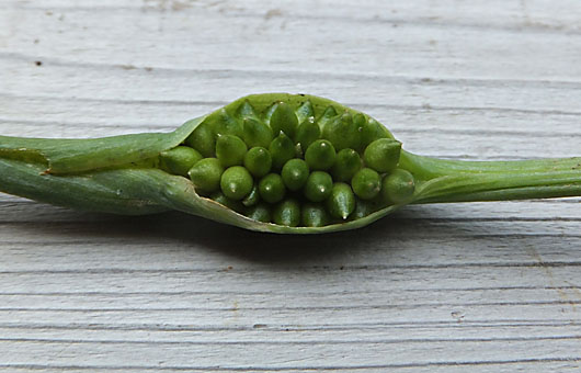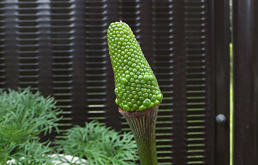 何回かこの場でも紹介して来たカラスビシャク(烏柄杓)の実をご紹介。この草、といっても我が家の小庭に限られるのかもしれませんが、受粉作業は余り上手でないのか、殆ど種子を実らせた状態を見たことがありませんでした。我が家では昨年あたりから個体数が飛躍的に増え、花(仏炎苞)や花後の推移を観察する機会もそれに比例して増えて来ましたが、種子が大きく育ったのを見たのは今回が最初です。 画像の固体で発芽の可能性がありそうな種子は、ざっと数えて34粒でした。これらが全てバラ撒かれてしまうと、その結果は考えたくない・・というのが正直なところです。これまでは専らムカゴで増えて来たのですが、この場合増加率はせいぜい年間2-3倍どまりでした。これに種子が加わると、収拾がつかなくなりそうな気がして、かわいそうですが摘み取って償却ゴミに仲間入りさせてしまいました。 南無・・・