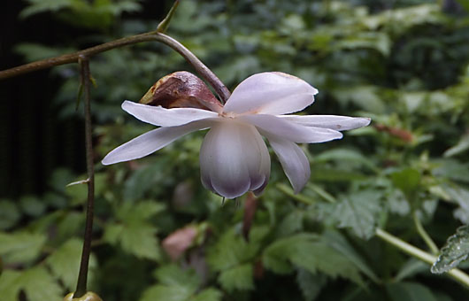 もう少し先かな、と思っていたレンゲショウマ(蓮華升麻)の開花が始まりました。3日前に紹介したツボミとは別の株で、物陰に隠れて(?)いたものが、一足先に開花してしまいました。何はともあれ、本隊の開花のスタートであり、今から約半月の開花ラリーが始まりました。 花の構造に注目してみると、画像の赤茶色のドーム型のものや、その内側で大きく手を広げて花弁のような顔をしている白いものは全て萼弁です。これらに隠れるように中心部でこじんまりと丸まっているのが花弁ですが、萼弁は最大180度を越えて開くのに対して、花弁は今の状態以上開くことはありません。花弁の先端はやや濃い目の紫で、付け根に向かって絶妙のグラデーションで白に変わります。この花の咲き方に「スマート」とか「しなやか」という形容は似合いません。何しろ花柄はツマヨウジほどあり、花の向きを変えることも容易ではありません。まるで摘み取った花にツマヨウジか竹串を差したような格好で、花の美しさとは甚だしい落差があります。