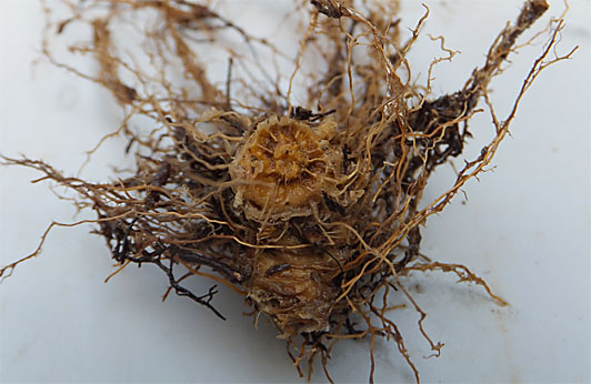 昨年の今頃、地上部が姿を消して、そのまま今年の春にも芽出ししなかったシライトソウ(白糸草)を、この際処分してしまおう、ということで用土を排出したところ、何と何と塊根もヒゲ根もまだ生きているではありませんか。 我が家にやって来たときと比べると、塊根の大きさは幾分小さくなり、ヒゲ根も少し減ったような気もします。どこが成長点なのかはっきりしないところも少々気になりますが、何とか息つなぎができたということで、感激は少なくありません。早速元のポットに新しい用土で植え戻し、ついでにマグアンプも追加しました。夏場の水切れで希望の灯火(?)を途絶えさせることがないよう、自動潅水のプレミアシートを割り当て、来年の春を待つことにしました。
