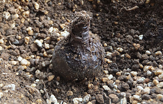 最後まで葉を残していた春出葉型のリコリス(彼岸花)もとうとう葉を消してしまい、我が家のリコリスのプランタは全て丸坊主になってしまいました。合わせて3個のプランタに、今年は多分50球を越える球根が眠っている筈です。6日前も書き込みましたが、それに近い陣容で昨年はたった1輪の花しか見ることができないという大凶作でした。今年の花期を2ヵ月後に控えて、作柄がどうなりそうか、気になるところです。 そこで品種名不詳、種々雑多見計い品を収容したプランタで、ご機嫌伺いをしてみることにしました。このプランタでは、昨年は全く花は咲きませんでした。8cmほど掘り下げた状態が、上の画像です。球根の大きさは、胴回りが概ね500円玉ほどで、巨大とは言えませんが、大きい方の部類です。このサイズなら花を咲かせるに十分なスタミナを蓄えている筈です。この玉を掘り返している際、隣の玉もチラリと見えましたが、同程度のサイズでした。片っ端から掘り返す訳にもいかないので、確認したのは2個だけでしたが、今年の作柄は大幅に好転しそうな手応えを感じました。