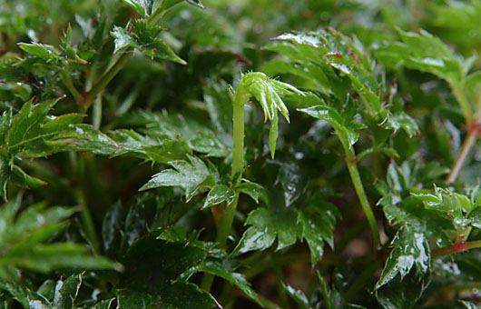 ヤクシマショウマ(屋久島升麻)に、やっと花芽のようなものが姿を現しました。本場・屋久島では、花期は7月から8月とされており、我が家のはまだかまだかと待ち焦がれていたものです。 という風に少々舞い上がりかけていますが、何分にも初めてのプロセスなので、これが本当に花芽なのか、あるいはちょっと出来損ないの葉っぱなのか、まだ確信をもって判定を下している訳ではありません。ただ普通に葉っぱだったら、この背丈(4cm)まで伸びるまでに、2回ぐらいは枝分かれしている筈であること、葉柄はツルツルであるのに対して、この新芽には硬さは分かりませんが小さなトゲのようなものがある・・などの点から、葉っぱではなさそう・・という結論に傾きかけています。もう少し丈が伸びればどちらかはっきりすると思うのですが、どっちに転ぶか、暫くは情緒不安定な日々が続きそうです(・・・ンな大袈裟な)。