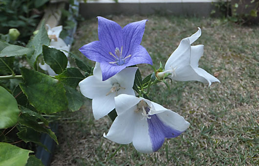 アポイギキョウ(アポイ桔梗)の1本の茎に、2色3パターン(白花、紫花、白に紫の絞り)の揃い咲きが実現しました。風に吹き倒されて、いささかだらしない格好での顔見世になりましたが、紛れもない異色の顔の揃い踏みです。とは言いながら、絞り咲きは開花が一足(2日ほどですけど ^^)早かったため、少しお疲れの様子が現れています。 この品種は足腰は弱いらしく、4-5月の成長期に低気圧などに伴う強風が吹くと、一溜りもなくなく倒れてしまいます。すぐに立て直して、支柱を当てるなどの処置を行えば、元通り直立姿勢が保てたかもしれませんが、そのまま放置したため横たわったまま茎が硬直してしまいました。今姿勢を正そうとすると、根元でポッキリ折れてしまうため、うっかり手を付けることもできません。・・・と、まあこれを言い訳に今年も何も手を打たずにやり過ごそうとしている訳ですが、この株については揃い踏みの発生確率も飛び抜けているので、次のシーズンにはビシッと直立した姿をお目にかけられるよう努力してみます。