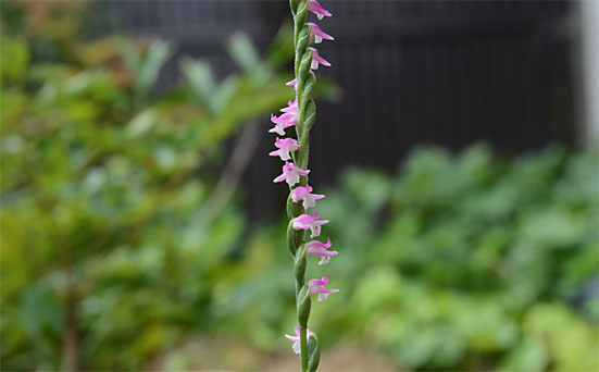 一般的な赤花のネジバナ(捩花)が本番を迎えました。露地ものの白花品から4週間近く遅れての開演です。白花の開花を取り上げた際、芝生に自然発生したものは4株と紹介しました。その時点で葉っぱが異様に長く伸びていたものをオウゴンオニユリの2歳児と誤認してしまいました。それらは全て画像のような赤花品だった訳で、都合8株が自然に芽吹いたことになります。 露地もの以外でもプランタに植えたものや、他の草花のポットに寄生したものも一斉に開花しています。これら寄生種は赤花、白花が混在していますが、いずれも家主の影になって日差しが不足したためか、草丈は極小で4-5cmしかありません。画像の固体が40cmに達しそうな状況にあることと比べ、住環境による体格差は歴然です。これら寄生したものは、花後休眠に入った時点で、専用のプランタに植え替えるなどして、環境の改善を進めることにします。