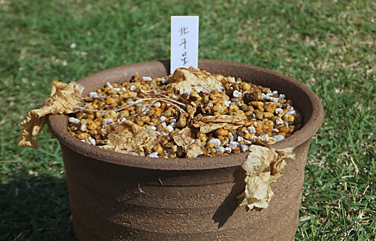 類似のネタが続きますが、最近枯れてしまった日本サクラソウの『北斗星』を処理することにしました。昨日紹介したシライトソウとは違って、こちらは塊根の芯まで既に黒変していました。ただ、ヒゲ根の一部にはまだ生命反応(?)が認められ、少々悪足掻きになってしまいますが、こうしたヒゲ根を”根伏せ”して復活を試みることにしました。 一部の草花ではヒゲ根を用土に埋めておくと、その根から発芽することが知られています。この手法はキンポウゲ科の草花や、サクラソウの仲間で特に有効・・という主旨の記事に触発されて、一度オキナグサの仲間で実験してみたところ、大成功を納めた実績があります。「2匹目のドジョウ」というより「藁にもすがる思い」で、かすかに生命反応の認められる『北斗星』の再生に賭けてみることにしました。下の画像がその作業の途中の様子です。この後、覆土して水切れリスクの少ない日陰の棚に移動しました。静かに、祈るような気持ちで奇跡を待つことにします。
