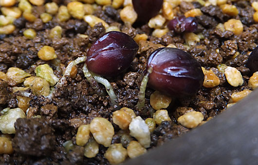 古いことわざに「親の意見となすびの花は、千に一つの無駄もない」というのがありますが、事情が許せば画像のオウゴンオニユリ(黄金鬼百合)のムカゴも仲間に加えたいところです。10個あれば10個が必ず発根します。不幸にしてムカゴの持つスタミナを全て使い果たしても、その根を潜り込ませる土壌がなければ、命をつなぐことはできませんが、コンクリートやタイルの上でなければ、間違いなくそこに根付き茎や葉を伸ばします。着地の不具合で発根点が天を向いていても、根は引力の方向を探るように土壌を探し当てます。いやはや恐るべき執念と思わざるを得ません。 サイズは大きいもので大豆粒ほどで、暗紫色をしています。今年も3桁に達するか・・というほどの大量のムカゴをばら撒きました。このポット(6号陶鉢)には10個ほどが着地し、全員無事に根を下ろし、土壌を探り当てました。 という風に、暢気に祝辞を送っていられるのは今年が最後になるかもしれません。何事もそうですが、度を過ぎて増えると、その後に待つのは邪魔者のレッテルであり、この子たちもその道を突っ走りつつあります。