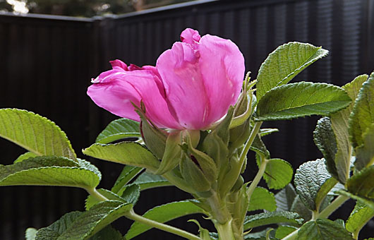 この猛暑の中、5月中旬に続いて、ハマナス(浜梨)の2度目の開花期が訪れました。とは言いながら、本場北海道では今が”旬”であり、我が家で5月に咲いたのは、単に寝惚けただけのことかもしれません。 この固体も、ルーツを辿ると9年前の8月の盆休み中に、道東・野付半島で道端にキレイに咲いているのが目に留まり、車を降りて写真を撮っていると、先行して咲いたものが実を結んでいるのがあって、完熟ではなかったようですが、持ち帰ったのが発端になっています。自生限界を超えて、「ざけんなよ!」と言いたくなるような猛暑の環境に連れて来られて、この子にしてみれば究極の不運だったのかもしれません。それでも持ち前の生命力にまかせて、しぶとく生き抜いて来ました。遠くの親類と時期を示し合わせたように咲いてはみたものの、アチラは20~25℃に対して、コチラは35℃に近く、かなり過酷な環境であることに違いはありません。 通常この花は早朝に咲くもののようですが、画像は夕方涼しくなった頃気付いて撮影したものです。かなり草臥れていますが、順番を待っているツボミが開花する時には、早朝の一番キレイな時間帯に写してやろうと思います。