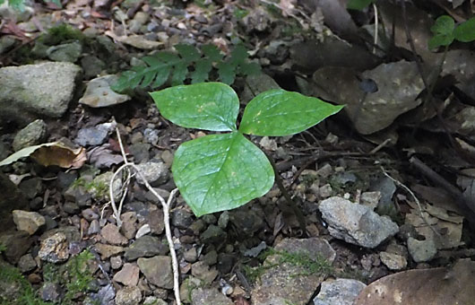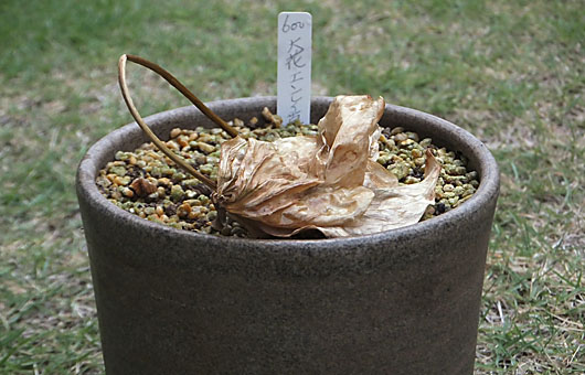 長ーい長いご無沙汰だった雨が、やっと昨夜降りました。今のところ北陸方面のような手荒な降り方はしていませんが、何とかお手柔らかにお願いしたいものです。我が家だけでなく、多くの人たちがこれを待っていた筈です。草も虫も、歓喜に包まれているに違いありません。 画像はそうした雨を待ちきれずに、枯れてしまった野草・大花エンレイソウ(延齢草)です。乾燥で枯れた訳ではなく、暑さに負けて枯れてしまった模様です。比較的標高の高いところに自生するこの草は、標高100mの我が家の居心地は決して良くはない筈です。 さてその枯れ方ですが、地上部だけ枯れたものか、根まで一緒に逝ってしまったかは、確認が必要です。という訳で、少し足元を掘り返してみました。嬉しいことに1.5cmほど掘ったところに、立派な越冬芽が用意されていました(下画像)。このまま大きなアクシデントがなければ、何とか来春もこの草に会えることが確認できました。取り敢えずはメデタシ、メデタシということでしょうか。