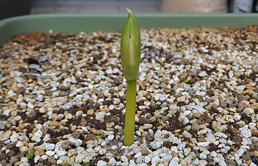 暑さの峠は越えたとはいえ、まだ8月というのにリコリス(彼岸花)が動き始めてしまいました。一般的な花の時期と比べると、1ヶ月近く早い始動です。画像の固体は「真夏のクリスマス」という白花の品種で、既に包葉の隙間から花弁の一部が透けて見え始めています。 この子たちが我が家にやって来て4年経ちました。これまで最も始動が早かったのは、9月10日頃でした。それと比べても12日も早いことになります。他には動き始めたものはないので、温度や乾燥など環境面の影響・・・というような大袈裟な問題ではなさそうです。 因みに、ここ数年の観察経験を当てはめると、この状態からから3~5日で開花します。9月早々には最初の花見ができそうです。昨年は大凶作で僅かに1輪しか花を付けませんでしたが、今年はその凶作分を埋め合わせるような作柄を期待しています。