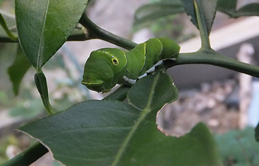 ぬぬっ!またも現れたか、曲者め。といっても、今シーズンこの曲者が我が家に侵入したのは初めてです。大きさは3cmほどで、土佐文旦の木(樹高50cm)に取り付き、古い葉、若い葉の区別なく平らげていました。この時点で何の幼虫なのかは不明でしたが、セオリー通りキ●チョールを一吹きして退場願いました。 ことが終ってから、かかり付け(?)のWeb図鑑サイトをめくってみると、アゲハチョウの幼虫であることが分かりました。その図鑑の説明によると、柑橘類はアゲハの大好物のようです。柔らかい葉の草花を横目に、こんな硬い葉っぱの柑橘類を選んだ訳がここでやっと納得できました。それはそれとして、アゲハならこれほど厳しい判決は必要なかったかな・・などと、少しだけ反省もしましたが、後の祭りです。 それにしても、アレやコレやと手を変え、品を変え毛虫、芋虫の類が後を絶ちません。石川五右衛門の「浜の真砂は尽きるとも・・・・」の名(迷)句を思い起こしてしまいました。