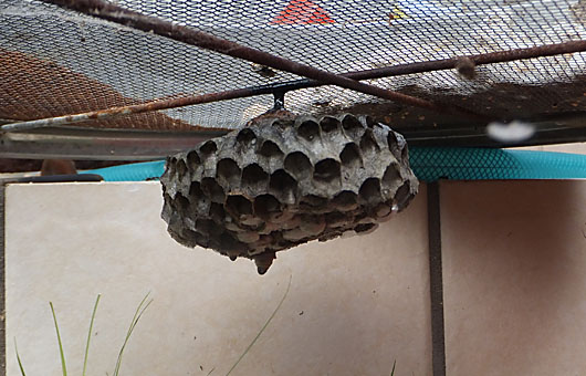 ちょうど1週間前に駆除して、親蜂がいなくなっていたアシナガバチの巣を昨日確認してみると、何と何と親蜂(女王蜂+働き蜂)が復帰しているではありませんか。どうしたことかと近付いてよくよく観察してみると、親蜂の数は駆除した時点では6~7匹だったものが、大幅に増えています。何はともあれ、放置する訳にはいかない・・ということで、常備薬・キ●チョールの再登板ということになりました。今度は全員飛び立つ余裕もなく、バタバタと落下してしまいました。静かになったところで頭数を数えてみると、女王蜂1匹と働き蜂12匹でした。 無人(?)となった巣をもう一度よく見ると、1週間前には中心部の巣穴にはフタがされていました。今はこのフタの大半がなくなっており、ここに収まっていたサナギが羽化して、新世代でファミリーを再構築した・・というのが実態のようです。現在もフタ付きの巣穴がいくつか残っています。この子たちまで根絶させようとすれば、水に浸すか、レンジでチンするしかなさそうです。焼却すればもっと簡単なのですが、これだけ大型の巣は記念に残したい・・というヨコシマな思惑もあって、踏み切れずにいます ^^。