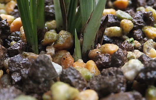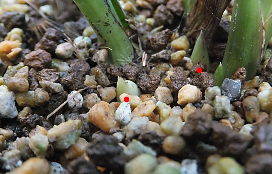 3週間ほど前に日本シュンラン「天紅香」に出現した新芽が、新子か花芽か判定にに迷う旨の書き込みを行いましたが、結果は花芽だったようです。これだけの期間があれば、新子なら先端が割れて、背丈も4-5cmほどに伸びている筈なのですが、伸びは止まったままで殆ど変化していません。取り敢えず来年も花見ができそう・・ということで、プチ幸福感を感じています。 それはさて置いて、緑色花弁の在来種にも花芽(画像の赤●印)が出現しました。今確認しているのは3芽ですが、昨年の状況を思い起こしてみると、9月一杯は顔出しがありうるので、更に増えることを期待しながら待つことにします。 昨年の反省点になりますが、花芽に遮光措置を全く講じなかったため、「天紅香」の場合本来なら鮮やかなオレンジの筈の花弁が赤黒味を帯びてしまうという失敗を演じてしまいました。もう少し丈が伸びたら、完全遮光を目指して、アルミ箔で遮光してしまうつもりです。