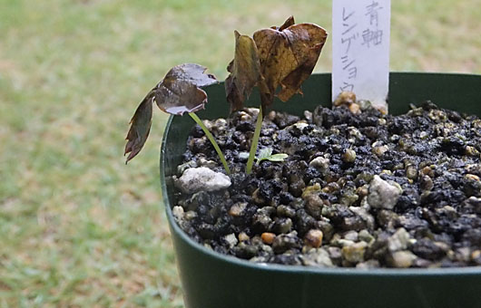 昨日は終日雨でした。幸いなことに・・・と言ってしまうと北陸や中国地方の人には申し訳ありませんが、この地域では適度な降り方で、砂漠のようになった我が家のプチ菜園や花壇を潤してくれています。この潤いに救われた草花も少なくない筈ですが、その一方で救いの雨も間に合わず、姿を消すものも少なくありません。 という前説とはかけ離れた事例になりますが、画像は多分乾燥ではなく暑さに耐えられずに姿を消そうとしている青軸レンゲショウマ(蓮華升麻)です。実生2年目の軟弱な幼児ですが、7~8年を経過した古株でも今年は耐えられないものも出る始末です。覚悟はしていたのですが、やはり・・という結果になってしまいました。 因みに枯れたのは地上部だけで、根はまだ生きているようなのですが、成長可能な時間をロスしたことになるので、例えば4年で開花できるところが、5年、6年という風に延びてしまうかもしれません。いずれにしても、来春の復活を信じて様子を見守ることにします。