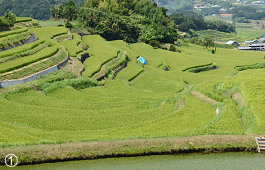 比較的近い場所である淡路島に棚田の絶景があるらしいことが判り、昨日出掛けてみました。場所は淡路市長澤、神戸淡路鳴門自動車道の北淡ICから7kmほど南に入った山里です。予め写真モードの地図で目星をつけてあった場所に直行しました。 車から降りて10分も歩くと、棚田の絶景が目に飛び込んで来ました。上の画像(1)は手近な場所に溜池の土手があり、絶好の俯瞰アングルで取れたものです。惜しむらくは穂が出るところまで成長が進み、波打つような曲線を描く畦が見えなくなっています、この場所は、田植え直後か収穫後にもう一度トライしてみたい場所です。これに対して(2)は、適当な高台がなく土手の積み重ねのような絵になってしまった例です。ここも何とか俯瞰撮影ができる場所を探しに、再訪したいポイントです。(3)は馬蹄形の溜池を中心に、同じく馬蹄形や勾玉形の田んぼが同心円状に積み重なった絶好の地形なのですが、残念ながら水田としての利用を放棄したようで、畑になりかけていました。水田としての再デビューは絶望的かと思いますが、実に残念です。 この日も猛暑が続き、汗だくになりながらの人里徘徊になってしまいました。田植えの時期や収穫時期など、もう少し涼しい時期を選んで、棚田の美観再発見にトライしたい場所です。