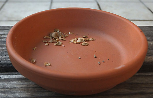 色合いで判定すると、まだ成熟しきったようには見えないエゾスカシユリ(蝦夷透百合)の果実に、どうしたことか割れ目ができてしまいました。放置すると自然に撒き散らされることになるかもしれず、少し(早いかもしれない)のを承知の上で収穫することにしました。 殻を開いて種子を採取していると、折悪しく吹いた風で半分以上を飛ばされてしまい、画像はその時の残り物です。「熟度の低いものが飛ばされて、残ったのは熟度が高く重いものだけ」などと都合よく解釈して、これを蒔くことにしました。発芽するかどうか、自信はありませんが、種蒔きポットを用意して作業を済ませました。果たして来春どういう結果が待っていることやら....