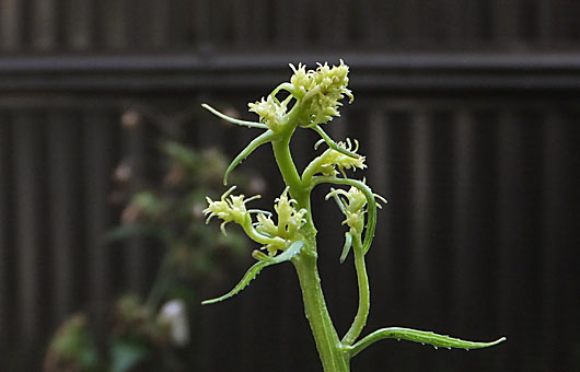 秋の花・ツリガネニンジン(釣鐘人参)のツボミが、何とか肉眼で認識できる状態まで成長して来ました。今年もたくさんのツボミが付きましたが、残念なことに花茎はクネクネと曲がって、お行儀が甚だよろしくない風景が出来上がりつつあります。 山野で出会うツリガネニンジンは、一般的に直立している上に、大抵の場合枝分かれした部分まで含めてストレートに伸びていますが、我が家のものはご覧の通りのひねくれ具合です。茎は野生品と比べてかなり太めですが、強靭さには欠けているようで、成長の途上で倒れてしまうのですが、先端は首を曲げて上に伸びようとします。このようなことを、春から繰り返してこんな姿になってしまいました。ポットに植えていた頃にはこのような状態は見られなかったことを考え合わせると、大量の腐葉土や発酵牛糞を鋤き込んだのが裏目に出ているのかもしれません。然らばどう対策するか・・という点については、今のところ効き目のありそうな対策は浮かんでいません。そんな保護者の悩みとは関係なくツボミは膨らんで、月が変わる頃には開花し始めます。
