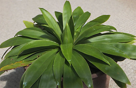 2日前にシュンランが半年がかりで花芽の準備を始めた・・という記事を掲載しましたが、こちらのショウジョウバカマ(猩々袴)も同じように半年がかりの準備を始めました。色は違いますが、中心部にミョウガのような格好で鎮座している塊から、花の房が顔を出します。時期はこの地方(神戸市)では3月から4月なので、半年を越える助走期間ということになります。因みに花色は、この固体については白花です。 ここ数年、夏場の強い日差しに対して養生を怠ってしまい、花の時期に葉っぱが赤茶けてしまうという失敗を繰り返して来ました。今年はこうした見苦しい葉焼けを防ぐゾ・・・ということで、早朝に日が差すだけで、9時以降は日差しが届かない場所に避難させています。今のところ目立った変色は出ておらず、日焼け防止はうまく行っているように見えます。このままの色で来春の花期を迎えたいものですが、日焼けの元凶・お天道サマはまだまだ元気ハツラツで、油断はできません。