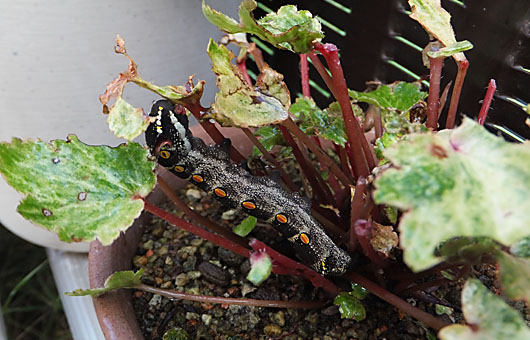ほんの2日余り家を空けた隙に、大(?)事件が起きていました。開花も間近という大文字草「天輝」が、曲者に食い荒らされて丸坊主になってしまいました。「名を名乗れ!」と言って、返事を貰える訳もないので、仕方なく毎度お世話になっているWeb幼虫図鑑をめくってみると、正体はセスジスズメという蛾の幼虫でした。体長は大人の小指ほどもあり、体に見合って驚くべき大食漢ぶりを見せ付けてくれました。5号陶鉢一杯に葉を広げて土を見るのも難しいほどだったものが、2日余りで9割方葉っぱを食われて、小豆粒ほどの糞30粒ほどに化けてしまいました。 この花の開花まであと2ヶ月ほど、この期間に葉っぱを回復するのは絶望的です。不幸中の幸い・・と言っては何ですが、花芽が立ち上がる前のアクシデントだったため、花見までは奪われずに済みそうです。とは言えこの状況では、赤い線香が立ち並ぶ中に、大文字の花を散りばめることになりそうで、いささか情緒に欠ける花見になるのは避けられません。 因みに、曲者に対するオシオキは、いつも通り「キ●チョール一吹きの刑」としましたが、効果は覿面で、1分ほどで動きを止めました。