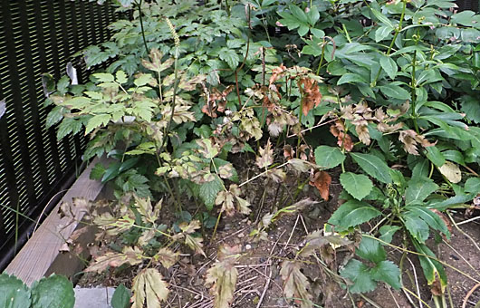今月に入って、夕立を含めて雨が降った記憶がありません。範囲を7月まで広げても、本格的な雨は降っていません。そんな訳で花壇も畑も、土壌はカラカラに乾いています。日課としての水遣りが欠かせない状況になっているのですが、手作業での水遣りでは水量は限られ、10分前後の注水では、表土の2-3cmまでしか水は浸透していないのではないかと思います。 そんな砂漠級の乾燥で、露地モノの草花に枯れるものが出始めてしまいました。画像はサラシナショウマ(更級升麻)ですが、花芽を含めて葉っぱまで枯れてしまいました。この他にレンゲショウマ(蓮華升麻)2株もツボミ毎ごと枯れてしまいました。昨年までは週1程度は何らかの降水があって、露地モノでこうした被害は想像したこともありませんでしたが、今年はお手上げです。打開策としては、夕立でも台風でもいいから天の恵みが欲しいところです。