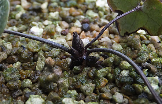 実生3年目の雪割草です。他の草花のポットに寄生して芽を出したもので、昨年独立して4号陶鉢に転居しました。品種は不明で、手強い暑さに揉まれて少々お疲れの様子が見てとれます。この春芽吹いた新しい葉っぱ1枚を失った上に、右奥の葉っぱは外周が枯れ始めてしまいました。何とか秋まで持ってくれればいいのですが、果たしてこれからの暑さを凌ぎ切れるかどうか・・・ 葉っぱはジリ貧ですが、コブクロは健全に発達しているようです。順調に育てば、種蒔きから4年目には花を付けると聞きます。花芽は株の中心の涙型の塊(コブクロ≠正式名)から顔を出します。以前新潟市の山野草店で、雪割草の花苗をいくつか購入した際、オマケで付けて貰った苗がちょうどこれくらいのサイズでしたが、その年に1輪だけ花を付けたことを考え合わせると、この子ももしかすると・・・などと期待してしまいます。何とか涼しくなるまで、スタミナ切れ → 昇天 などという悪夢を見ないで済むよう、バックアップして行くつもりです。