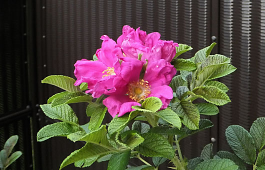 3日前にも紹介したハマナス(浜梨)が、一気に3輪開花しました。前回は開花後半日経っての撮影になってしまい、ヨレヨレの状態を撮るハメになりました。次に咲く花は開花直後の新鮮な状態を・・・ということで、それ以来朝から見回りをしていたのですが、残念なことに開花直後でもヨレヨレであることに大差はありませんでした。いやはや、気合を入れて待ち受けていた割には草臥れ儲け、という結果に終わってしまいました。これで用意していたツボミの半分は開花してしまいましたが、残りのツボミもその顛末を公平に見届けてやろうと思います。