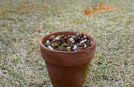 昨年7月に実家から連れ帰ったシノブ(忍)です。適当なポットがなかったため、取り敢えずの措置として素焼きの3号鉢に植え付けていました。幸いなことに何とか無事に定着した様で、昨秋に続き、今年に入ってからも新しい葉を出していました。 3月中旬になってそこそこ暖かくなったのを機に、それまで屋内で過保護気味に管理していたのを屋外に出していたのですが、これが良くなかったらしく、虎の子の葉っぱは黄変してしまいました。それはそれとして、他にも大きな問題が発生していました。ポットが素焼きであるため、水遣りしても鉢本体が水分を吸い上げて蒸散してしまい、想定以上に用土の乾燥が早いことと、その湿気を帯びた鉢本体にカビが発生し、2週間ほどで真っ黒になってしまうことです。こうした欠点をカバーする目的でこの子たちには引っ越して貰うことにしました。 こちらが引越しを終えた様子です。新居は従来と同じ3号陶鉢ですが、こちらには軽く釉薬が施されています。因みに、茎の大部分は地中に埋めていますが、この隠れた部分で枝分かれが進行しており、梅雨の頃には地上に顔を出すのではないかと思います。