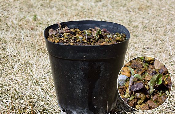 足踏みする春の草花を見回っていて、半ば諦めて放棄同然になっていた種蒔きポットに青みが差しているのに気付きました。最初は雑草が芽吹いて来たかと疑いましたが、よくよく見ると葉っぱはトランプのクラブの形に似ています。 お~~、これは雪割草の新芽ではありませんか。とっくに発芽は諦めて、品名ラベルも捨ててしまったため、どんな品種なのかは不明です。発芽時の2枚葉は茶色く枯れているところを見ると、発芽は昨年だった様で、今は生育のよい個体は本葉が2枚芽吹いています。これなら上手くフォローすれば、来春には花を付けるかもしれません。但しそのためにはポット一面に根を降ろした雑草どもを根こそぎ駆除しなくてはいけません。 そうした雑草を一つ一つ抜き上げて行きます。土中に張り巡らされたヒゲ根もフォークで掬い上げて除去します。そうした作業で嵩が減った用土を補って、一通り生育環境を整えた様子がこちら。駆除した”つもり”になっている雑草どもは、いつ目覚めて暴れ出すか判りません。当面は重点管理品として念入りに監視していく必要がありそうです。