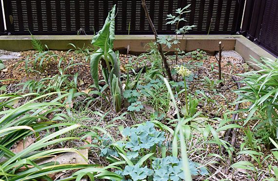 画像は我が家のプチ花壇の一角です。定住を認められた住人より一足早く、雑草や定員を超過した(かっては定住権を認められていた)お邪魔虫たちが我が物顔でのさばっています。こうしたお邪魔虫たちは、この辺で駆除しておかなくては、梅雨を迎える頃にはここはジャングルに戻ってしまい兼ねません。因みに画像中央付近で幅を利かしているのは、間もなく開花(展開)するムサシアブミ(武蔵鐙)です。あと2日ほどでしょうか。 お邪魔虫の代表格はオウゴンオニユリ(黄金鬼百合)の発芽株です。この品種は一昨年までは定住権も認められ、保護していました。それが旺盛な繁殖力をバックに急速に数を増やしてしまい、ついには数量規制の対象になってしまいました。画像で地表付近に広く分布している、丈の低い緑がそれです。他にカタバミ(片喰)やホトケノザ(春の七草とは異なる)も大量に繁茂していました。こうした駆除対象を、草抜きで根の周りの土を解しつつ、ヒゲ根や球根ごとごっそり抜き上げていきます。1時間ほどかかって、1平米ほどを処理した様子がこちら。Affter画像の中央手前は今月後半には咲き始める白花オダマキ、右は定住認定のオウゴンオニユリです。こんなお邪魔虫駆除が、あと2平米ほど残っています。
