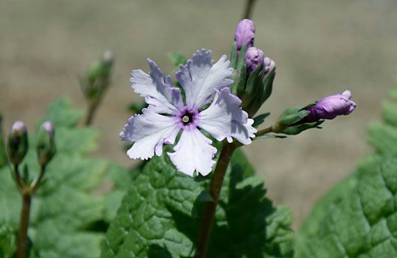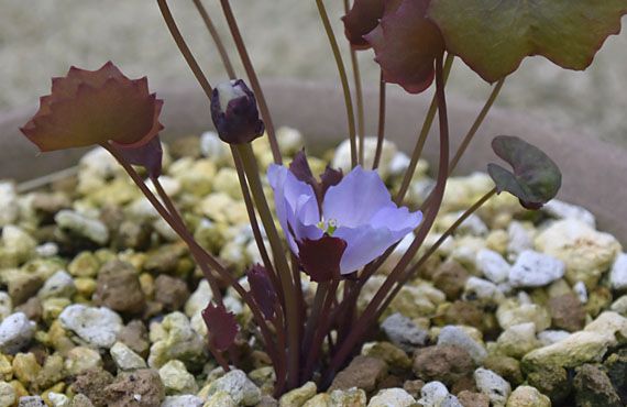 ユキワリコザクラ(雪割小桜)が最後っ屁(失礼!)の様な花を咲かせました。この品種は4月早々にホームセンターの園芸コーナーに並んでいたものを買い求めて来たものです。その時点で花は粗方終了していましたが、次の年に備える目的でリクルートしたものです。今年の花は種苗会社かHCの皆さんが咲かせた様なものなので、特段この場で取り上げることはありませんでした。 花も散って花軸もそろそろ枯れようかという時期になって、遅刻してきまり悪そうな格好で小さな花軸が立ち上がり、昨日何とか開花に漕ぎ着けました。この遅刻花も育苗や流通サイドの方々が咲かせた事実に変わりはありませんが、半月余りも遅れながらも開花に漕ぎ着けた執念に免じて、この場で取り上げることにしました。次のシーズンには私のアシストで開花に漕ぎ着けた・・・といえる様、是非とも頑張って生き延びて貰いたいものです。