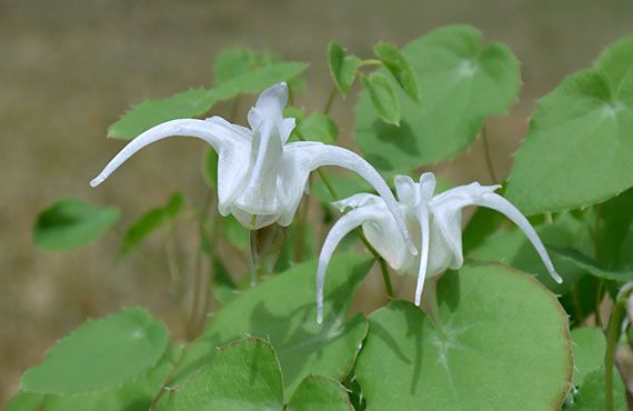 イカリソウ(錨草) 2品が開花しました。上画像が白花の「小雪」、下画像は黄花の「アンバー・クイーン」です。両者共、昨年に比べて2週間遅い開花です。見事なまでに横並びの遅れぶりです。 下の「アンバー・クイーン」は常緑性で、冬も完全に葉っぱは枯れないタイプです。ツボミが発生し始めた頃に、葉が黄変した茎は切り払いましたが、今でも昨年の葉が多数派を占めており、画像後方の葉も前年のものです。今のところ白花、黄花ともツボミの数は前年並みの出来高になりそうな、やや貧相な出来映えですが、株の構成は6.5号陶鉢で窮屈そうな雰囲気です。この秋の手入れでは株分けを伴う植替えに大ナタを振るう必要がありそうです。 ところで一足早く咲き始めた「楊貴妃」は全5鉢が咲き揃うところまで来ましたが、うち一つで変り花が現れました。この品種は花弁や距、萼片は基本的に4枚なのですがこの程5枚のものが見つかりました。10年近く栽培して来て、初めて現れた珍現象です。キンポウゲ科の草花では、基本6枚の花弁が7枚だったり、5枚だったりと変化することは頻繁に起こりますが、イカリソウでは初めて見る姿なので少々興奮しています。こちらがその5枚弁の個体ですが、変異はこの1輪だけの様です。