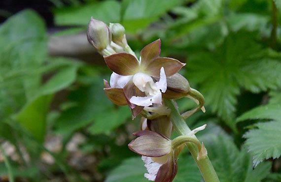 地エビネ(海老根)が咲き始めました。1週間ほど前、花芽に気付いた時点で取り上げた時には、開花は5月に入る・・・などと予想を交えて紹介しましたが、その予想は「大外れ」ということになってしまいました。いやはやお恥ずかしい限りで.....。”開花”とはいっても、取り敢えず花弁を開いてみた・・・という段階で、花柄は軸に巻き付いていた名残を留めたままです。この花柄が真っすぐに伸びれば、花弁を正面から眺めることができるのでしょうが、今はどの花も顔を45~60度傾けた様な状態です。 この花軸には合計10輪の花とツボミが付いています。最初に開花したものが健在なうちに花軸先端のツボミまで咲き進むものらしいので、小規模ながら楽しめるボリュームが実現するかもしれません。花軸はもう1本準備中ですが、こちらは少し遅れていて、まだツボミは確認できません。向う1週間は暖かい日が続きそうなので、こちらも開花に向けてピッチを上げそうです。