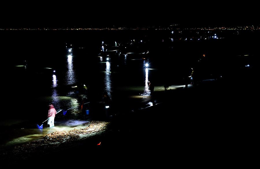 昨日紹介したホタルイカ見物ツアーの続きです。一昨年の空振りに続き、本年も空振りでした。この日をツアー実施日に選んだのは、ホタルイカ接岸が3月から5月の新月の日、及びその前後に限られる、という定説に従ったものです。現地には明るい内に到着したので、早速情報収集に取り掛かりました。滑川市のホタルイカミュージアムの職員や現場にホタルイカ採取に訪れていた何人かに話を聞きましたが、今年は例年より接岸量は圧倒的に少ないという声が多数聞かれました。加えて接岸を見越してアマチュア漁師が激増していて、微妙なホタルイカの発光をカメラで捉えるのはムズイんじゃね?などという、警告も戴きました。画像がそのアマチュア漁師群です。撮影時間は午前0時少し前、といった頃ですが、その後も漁師は増え続けていました。ライトは年々強力になっているようで、これではターゲットが記録的な規模で接岸したとしてもカメラでそれを写し取るのは困難かもしれません。 ホタルイカの接岸は空が白み始めるころまでは可能性があるようですが、当方にそれに対応するだけの根性が備わっていなかったことや、この強力な照明群の中で微かなホタルイカの光を捉える自信がなかったことから、尻尾を巻いて帰路に就いてしまいました。今回のツアーは、ただ疲れに行っただけだった様です。