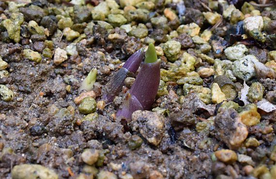 ドイツスズラン(鈴蘭)も始動していました。この品種、一昨年は大豊作だったのですが、一転して昨年は作落ちしてしまいました。隔年で豊作と不作を繰り返す果樹などと同列に扱う訳にはいきませんが、今年は是非とも豊作であって欲しいと願うばかりです。 そうした願望の傍証になるかどうかは分かりませんが、今年の芽出しの様子はかなり体色もいいし、一見頑丈そうに見えます。これなら体内に花芽を抱いていても違和感はありません。もう1つ、新芽の数は前年に比べてかなり増えています。まだ全ての芽出しが終わった訳ではないと思われるので、こうした点も豊作願望を後押しする要素です。・・・などと都合のいい状況をあげつらってしまいましたが、これ以上は贔屓の引き倒しになりそうですね。