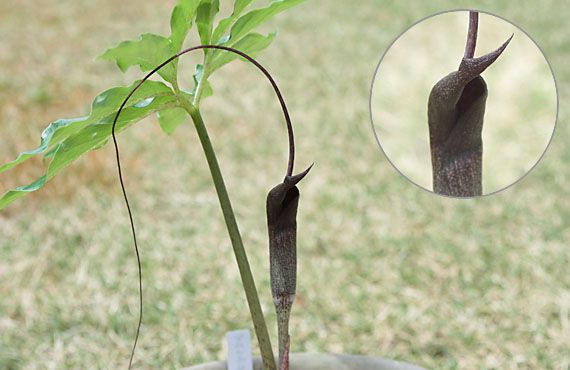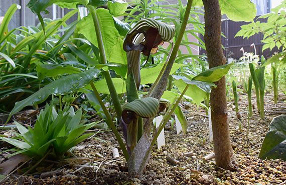 ほんの1週間前までマムシグサ(蝮草)とばかり思っていたものが、実はウラシマソウ(浦島草)だったという間の抜けたお話です。上画像がそのウラシマソウですが、1週間前に仏炎苞が姿を見せ始めて間もなく、先端から紐状の何かが伸び始めました。その時点で、オヤッと思うようになっていましたが、それが日増しに成長速度を上げ始めて、やっとこれがウラシマソウであることに気付いたという次第です。 確かに4-5年前までウラシマソウも栽培していました。その頃から夏場の猛暑に負けて、地上部は梅雨明け直後には枯れてしまうというサイクルを繰り返していましたが、いつの間にかそのポットがどこでどうなったか分からなくなって、全滅したものと思い込んでいました。昨年春、放置していたポットからコンニャクに似た小さな葉っぱが芽吹きましたが、その時には仏炎苞は出ませんでした。葉っぱの様子から、「多分マムシグサだろう」→「マムシグサのはず」と変化し、遂には”マムシグサ”のラベルを差すに至ってしまいました。2年がかりでコトの真相に辿り着いた訳ですが、何はともあれ全滅したと思っていたウラシマソウが生きていたことはメデタシ!メデタシ!です。 先般、ムサシアブミが見頃を迎えた際、”不気味三兄弟”と説明しましたが、これで”四兄弟”、いや”四天王”が復活、揃い踏みということになりました。