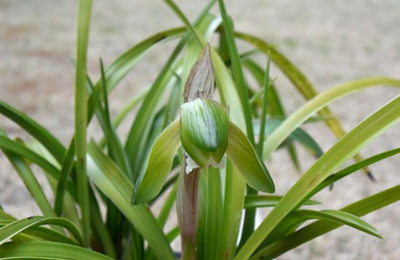 露地の日本シュンラン(春蘭)に、早くも新子が顔を見せました。例年だと新子が目に入る様になるのは、早い年でも5/10前後、遅い年は6月にずれ込むことも珍しくないのですが、今年は記録的な早出しです。他の草花が大幅に開花時期を遅らせている状況下でこの早出しなので、落差は際立ちます。 在来種、選抜種を含めて、我が家の日本シュンランは増加傾向が顕著です。山野に自生する個体が激減する中で、我が家で手に余る個体は自然に還すことを企んでいるのですが、この個体がその企みの第1号候補です。理由は手狭になったプチ花壇に空き地を確保する必要性が生じたことなのですが、後継者込みで移植できれば、定着の可能性はより確かになる訳で、まずはメデタシ!といえそうです。因みにこの個体は緑色の花弁の在来種なのですが、続いてオレンジ花弁の選抜種も移植するつもりです。
