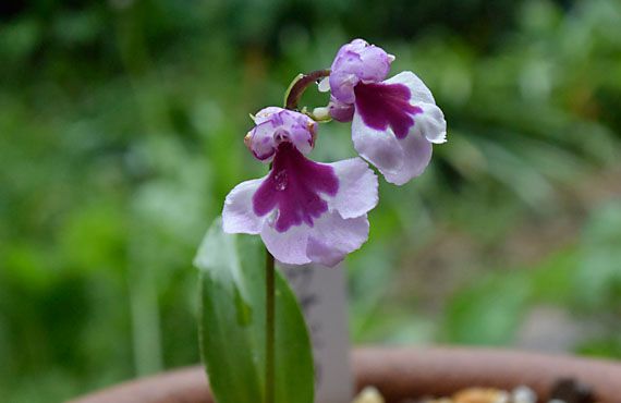 イワチドリ(岩千鳥)が開花しました。この品は今年春リクルートしたばかりなので、前年比較はできませんが、異常なほどツボミの期間が長かったことを思うと、これもまた「右に倣え」で開花が遅れたと思って良さそうです。ツボミ状態で長時間を過ごしたことを、花の後の天弁、側弁のエッジの変色(茶色)が物語っています。この変色は、開花前から花弁の腐敗が始まっている状態で、花は鮮度を落しながら開花したことを示しています。 この品種は草丈は大きくても10cm止まりで、狭小な長屋住まいの身には最適なグループに属します。品揃えの間口を広げる前に”お試し”で入手したもので、花のグレードとしてはさほど高いものではありません。1点栽培してみて、我が家のベランダの夏の高温や乾燥に耐えられるかどうかを確認するのが目的で、問題がなければ改めてハイグレードなものにも・・・という、やや不純な動機に基づくものです。動機は褒められたものではありませんが、面倒見の点で万全を期するのは言うまでもありません。