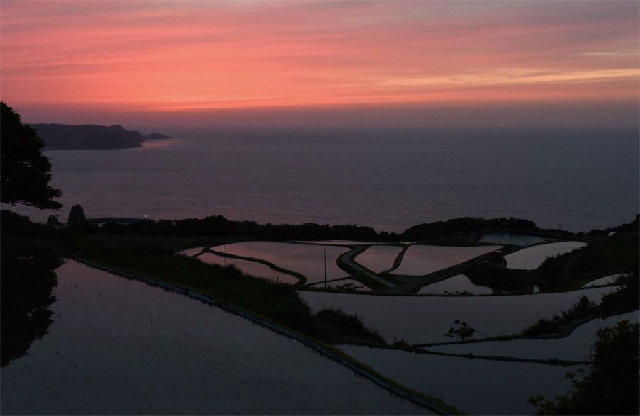 表題の3点揃い踏みの絶景が見られるという評判を聞いて、山口県の長門市まで出掛けてみました。Webで画像検索すると、実に美しい写真が多数ヒットし、見ていて飽きることがありません。ワタクシもあんな風景に浸ってみたい…ということで、いざ出動…と相成った次第ですが、そこは自然が相手、何時でも万事うまく運ぶことは殆どありません。 まず夕焼けは?というと、朝、上空は厚い雲に覆われていて、どうなることかと気を揉みましたが、夕方までにこうした雲も取れて、高層の薄い雲が残るだけになっていました。この高層の雲が適度に夕日の赤みを反射して、なかなかの出来栄えでした。100点満点で70~80点、合格点です。 次の棚田は?というと、出掛けたタイミングが少し早かったことと、耕作放棄と思しき田圃が散見され、出来栄えは50~60点、「もう少し頑張りましょう」といったところです。 3つ目の漁火は、今年イカが不漁ということで、漁師さんたちが出漁を放棄してしまい、画像の視野内に漁火は皆無です。ということで、ここは0点です。 ということで、総合評価は40~50点といった所で、合格には届きがたい成果でした。出先での処理のため、画像はJPG画像をちょっといじったたけなので、帰宅後RAF画像を編集して、もう少しシャキッとしたものにしたいと思っています。