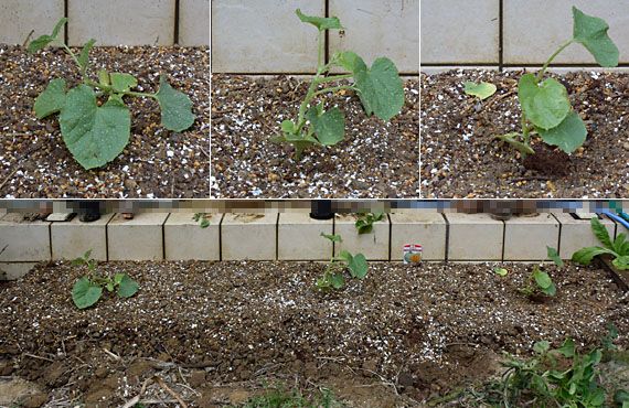 3日前にこの場で紹介したメロン・「シルクロード」の苗が、弱ってヘロヘロになる前に植え付けてしまえ・・・ということで、プチ菜園の一角を手入れをした上で実行してしまいました。この菜園は何度か紹介した通り、大量の腐葉土や醗酵牛糞を梳き込んでいて肥料分は豊富なのですが、基本的に土壌が粘土質であるため、乾燥が進むとカチンカチンに固まってしまいます。この欠点を克服する目的で、劣化した園芸用土(主成分は赤玉土と鹿沼土)や針葉樹の樹皮を粉砕したものの他、卵の殻を粉砕したものを梳き込みました。作業が終了した状態では土壌はフカフカですが、今日の雨が上がった後どうなるかが注目点です。 画像の下半分が植え付けた場所の全景、上半分が各々の苗の植付けた状態です。今日の雨で苗の定着はかなり後押しされるのではないかと期待しています。気になるのは、添付されていた栽培マニュアルによると、雨に当たらないところ、つまりビニールハウスがベスト!!なんだそうですが、我が家でそれは実行不可能です。もしかすると、この点が命取りになるかも・・・という気がしないでもありませんが、「当たって砕けろ」で進むしかありません。