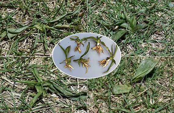 間もなくネジバナ(捩花)が花のシーズンを迎えます。そんな中で、芝生に根付いたネジバナたちが悲惨な状況に陥っていました。園芸活動上、主要な通路となる芝生に根を降ろした個体は、行きに帰りに踏み付けられてクシャクシャになってしまいました。犯人は勿論ワタクシです。 多分、こんな状況でこれらの個体が今年花を咲かせる可能性は低いと思われます。ただ、このまま放置すると、いずれは枯死、消滅の道を辿るのは間違いなさそうです。自然界でこの花を目にする機会が激減している中で、折角芽吹いた個体をみすみす消滅させるのは避けたいところです。ということでこうした危険ゾーンに根を降ろした個体を掘り上げ、適当な場所に引っ越しさせることにしました。今回対象となったのは円内の5株です。 引っ越し先は芝生の周辺部か、それともプランタにするか迷いましたが、今回はプランタへの引っ越しを選びました。理由は周辺部は芝の伸び方が顕著で、後々芝刈りの際誤って刈り払うリスクを避けたかったためです。引っ越し先の様子がこちら。上段と左のクシャクシャの個体が今回引っ越したもので、平穏無事に生活してきた個体(画像下部)との差は顕著です。8月には一旦葉っぱは消滅しますが、無事に定着していれば9月ぐらいから新しい葉を出し始め、冬の間にほぼ今の葉の枚数を回復します。引っ越し対象はこれで約半分ですが、猛暑もあって昨日はこれだけで屋外作業は打ち切ってしまいました。