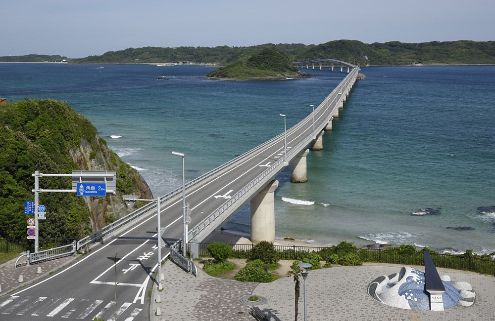 昨日紹介した東後畑棚田へのツアーには、もう一つおまけが付いていました。棚田の現場から西に28kmほどの所に、角島大橋という全長2kmほどの橋が架かっています。この橋と青い海のコントラストが実に美しいというウワサを聞き、棚田見物のついでにこれも組み込んでしまえ、ということでセットのツアーとなった次第です。 実は棚田より先にこの橋に行きました。何分にも夕日の棚田は夕方なので、その前にこちらの橋を先に見ておけば、1日で案件2つが片付く・・・という魂胆です。現地に着いたのは朝5:30頃でした。こちらも早朝は厚い雲に覆われていましたが、ダメ元で3時間ほど仮眠を取っている間に上空は晴れて来ました。画像はこの頃撮影したものですが、太陽光が薄い雲に散乱されて柔らかくなり、影にドギツさがなくなったのはラッキーでした。いつもの要領で画像をクリックすれば、一回り大きなサイズでご覧戴けます。