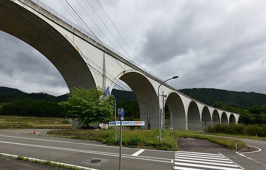 R427を西に走っていると、遠坂峠辺りで遠くにきれいなアーチ橋が、一瞬ですが望めます。いつか近くで写真に収めたいと思っていましたが、延び延びになって数年が経過していました。橋の場所は播但連絡道路の和田山JCT直前で、最近急激に人気が上がっている”天空の城”・竹田城跡の山にくっ付く形で掛かっています。橋の名前は「虎臥城(とらふすじょう)大橋」といい、この名は竹田城跡が乗っかっている山に因んでいるとか...。遠くからは分かりませんでしたが、緩やかにカーブしています。 この時期(5/27)を選んだ理由は、アーチ橋が水田に写り込めば”眼鏡橋”になるかも・・・という、期待先行型の決定プロセスに基づいたためです。自宅を出た頃は、上空は雲一つない好天気だったのですが、北上するに連れて雲が増えてしまい、現地は画像の通りの大曇天です。ただ東の空には青空も覗いており、橋には日差しが差して白く浮き上がっていました。 ”眼鏡”の方はどうだったかというと、こちらの通りです。絶え間なく微風が吹いていて、”眼鏡”は崩れ気味で不完全なものになってしまいました。時期も少し早かったようで、「ここで撮りたい」というような大きな田圃では、本格的な水張りはまだ始まっていませんでした。時期を改めて青空を背景に再挑戦したいと思っていますが、実現は何時になることやら・・・