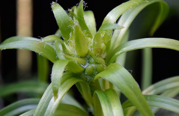ちょうど1週間前にこの場で取り上げたサワラン(沢蘭)のツボミが膨らみを増してきました。現在のツボミの大きさは1.5cmほど、花茎の丈は20cmほどに伸びています。ツボミの色はすっかり開花時の花色に染まっています。1週間前の予想より、かなり早く開花することになりそうな勢いです。1週間前に1茎2花が準備中と書き込みましたが、2花目は殆ど成長していません。期待した2花揃い踏みは敢えなく潰え去ってしまいました。 一昨日取り上げた原種ユリで、蜘蛛の幼虫が多数寄生していることを紹介しましたが、このツボミにも蜘蛛の幼虫や多数のアブラムシが寄生しています。不覚にも撮影時には気が付かず、後に画像をトリミングしていて気付いた次第です。開花を控えて今日にもピンセットで駆除してしまおうと思います。