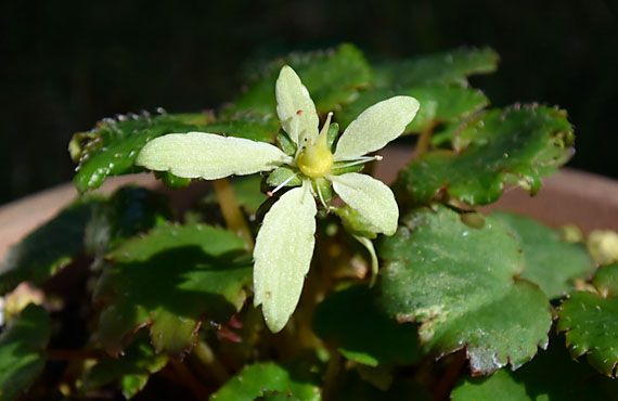 何ということでしょう。秋の花、ダイモンジソウ(大文字草)の「瀬戸翠」が開花してしまいました。昨年秋にこの品を購入した時、花は既に終わっていたため、開花した様子は目にしていませんでした。それがこの時期に面会することになろうとは予想もしていませんでした。苗のポットに付属していたサンプル画像では、確かにこんな色でしたが、バラツキの極限品だろう・・・という程度に受け止めていました。実際は謳い文句通りの発色だった訳で、多少とも疑ったことを恥じる次第です。 ダイモンジソウの現有勢力は、この品を含めても4点だけです。他の3点はいずれも赤系統なので、この淡い緑の1点は貴重な存在で、AKB48で言えばセンターポジションを占める存在です。とは言いながら、この様に寝惚けて開花した年は、本番シーズンには作落ちすることがない訳ではありません。この秋のシーズンがちょっと心配です。