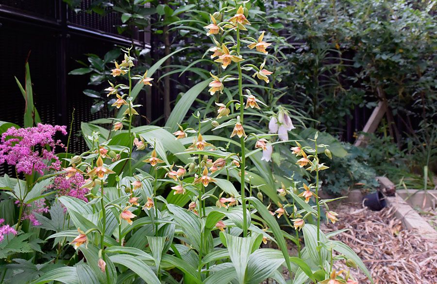 カキラン(柿蘭)がはぼ満開の域に入りました。今年は花茎の数は勿論、花の密度も含めて我が家史上最高の出来高です。いや~メデタシ!メデタシ!! ・・・という風に浮かれている一方で残念な点もあります。花茎の丈がバラバラで、統一感が全くないことです。全体像を1枚の画像に収めようとしても、縦方向が長くなって左右に空き地、じゃなくて無用の景色が映り込んでしまいます。個体ごとの成長ペースの違いが、こうした不具合を生み出しているのですが、何とかしたいものです。 余談ですが、左に映り込んでいるピンクの塊はシモツケソウ(下野草)ですが、開花から3週間が経過し、そろそろ幕を降ろす時期を迎えます。また右側の枯れ草を敷き詰めたような場所はリコリス(彼岸花)のエリアで、先月末頃から葉が黄変し始め、とうとう完全な枯野状態になってしまいました。早いもの(「真夏のクリスマス」=白花)は8月下旬には咲き始めます。あと2ヶ月と少しですが、個体数は今年もかなり増えていそうな気がします。