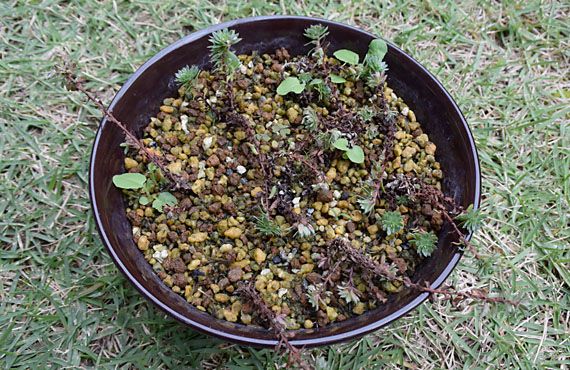 老齢株の若返り目的で挿し芽をしていたシコタンソウ(色丹草)が40日目を迎えました。順調ならそろそろ変化が起きていてもいい頃、ということで、様子を見ることにしました。上の画像が昨日現在の様子ですが、一部は挿し芽実施時と比べて、葉の量が増えているのが確認できます。その一方で雑草も発芽して、元気一杯成長を遂げようとしています。まずはこれらの雑草の駆除からスタートします。 続いて葉っぱの増えた個体の一つを掘り上げて、根の様子を確認します。上の画像で、9時の位置に挿した芽は葉も枯れてしまい、残念ながら定着できなかった様です。それに対して、こちらが8芽ほど挿した内の、ポジティブな変化を遂げた個体の様子ですが、新たな枝葉に加え、白いヒゲ根も発生しています。少なくともこの個体は新株として成長を始めていることが確認できました。この個体は元に戻すのも芸がない話なので、新居に引っ越させ、独立した生計(!?)を営ませることにしました。こちらが新居の様子で、ポットのサイズは3号です。秋の手入れの頃を目途に、再度6.5号程度のポットに植え替え、来春の花期にはかって見られたような豪快な花見の再現を目指します。