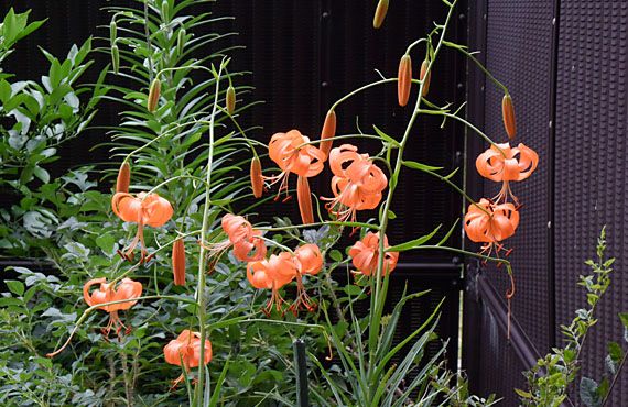 原種ユリ(Lilium davidii )が佳境に入りました。1番花が開花したのは1週間前のことでしたが、既に3輪が散って残骸化してしまいました。未開花のツボミも残っていますが、これからは新規に開花する数より散る数が次第に優勢になります。ということで、今の状態が花のボリュームとしてはピークに近く、この週末ぐらいから終幕に向かうことになりそうです。 入れ替わる様に出番を待っているのが、後方に写り込んでいるオウゴンオニユリ(黄金鬼百合)で、まだツボミは固く、外見に花色も現れていませんが、来週中には出番を迎えるのではないかと思います。こちらは増え過ぎて手を焼いている”規制品種”で、その元凶であるムカゴを一度は全摘したのですが、同じ部位に2番手が発生し始めて、管理人を慌てさせています。2番手、3番手に泡を喰らうのなら、花が終わった時点で地上部をバッサリ刈り払ってしまおうか・・・などと、かなり乱暴なことも考えています。因みに原種ユリにはこうした元凶、ムカゴは一切発生しません。
