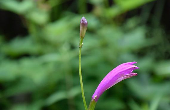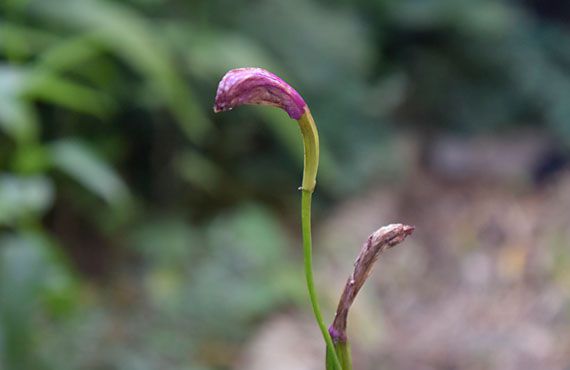 1週間前に開花したサワラン(沢蘭)もとうとう萎れ始めてしまいました。その花芽が立ち上がった頃、先端にツボミが2個付いているのを見て、”レアケース”ということで狂喜したものですが、片方が先行して開花した頃にはもう一方は動きを止めてしまい、一時はこのまま立ち枯れか・・・と、少なからずガッカリしたものでした。 ところが長女(1番花)が萎れ始めると、そちらに振り向けていた養分が次女(2番花)に回せるようになったのか、少し膨らみを増した上に、ツボミが赤みを帯び始めました。一時は諦めていた一茎二花が、時間差は付いてしまいましたが、もしかすると実現するかも・・・と、僅かな希望が出て来ました。とは言うものの、次女の方はツボミのサイズといい、茎の太さといい、比べようもないほど貧相です。開花できたとしても、自分の頭(花)を支えられるかどうか、かなり怪しい雰囲気です。ひたすら「がんば!!」と声援を送るばかりです。