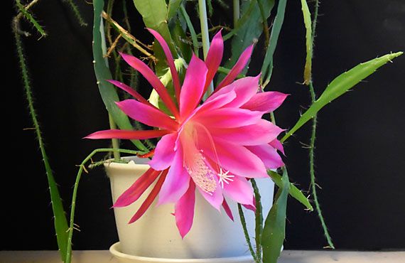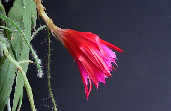 クジャクサボテンが開花しました。ここ3年ほど作落ちが続いていたので前年比は出せませんが、最後の開花となった2013年と比べると、3週間遅れということになります。常時屋内に収容していて寒気に晒されることはない点を考慮すると、今年の成績はかなりの怠慢(!?)ぶりが伺えます。 という様な背景は横に置いて、何とも豪快な花です。全開時の花の直径は軽く20cmを超えます。例えていうと、かなりガッシリした大人の掌、思いっきり開いたパーといい勝負です。これで適当な”実”が生れば言うことなしなのですが、その気配は見せていません。純粋な非結実なのか、或いは近縁種の別品種の花粉が必要なのか、その辺は分かっていません。 ところで”葉”なのか”幹”なのかはっきりしませんが、画像の通り複雑に枝分かれして、一見してジャングルのような構成になってしまいました。花付きとは無縁の”枝”が大半で、随分無駄な構成になっています。今年は新規に差し芽を行って、こうした無駄のない株を仕立てたいと思っています。